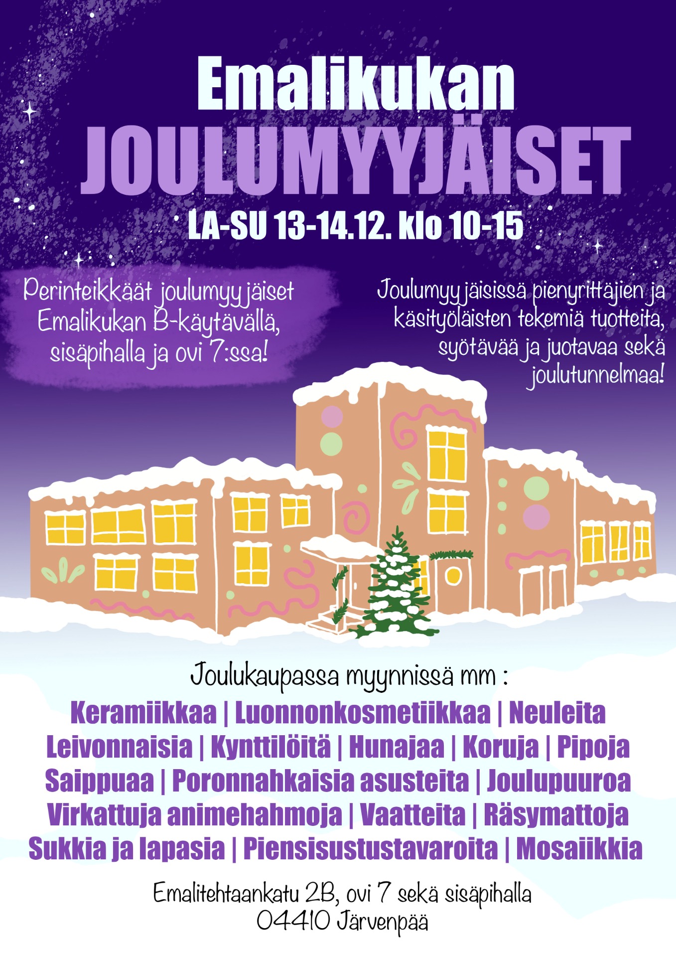 Perinteiset Emalikukan Joulumyyjäiset palaa jälleen! Tapahtumassa monenlaisia käsityöläisiä ja pienyrittäjiä myymässä tuotteitaan. Tapahtumassa on myös syötävää ja juotavaa sekä herskyvää joulutunnelmaa!